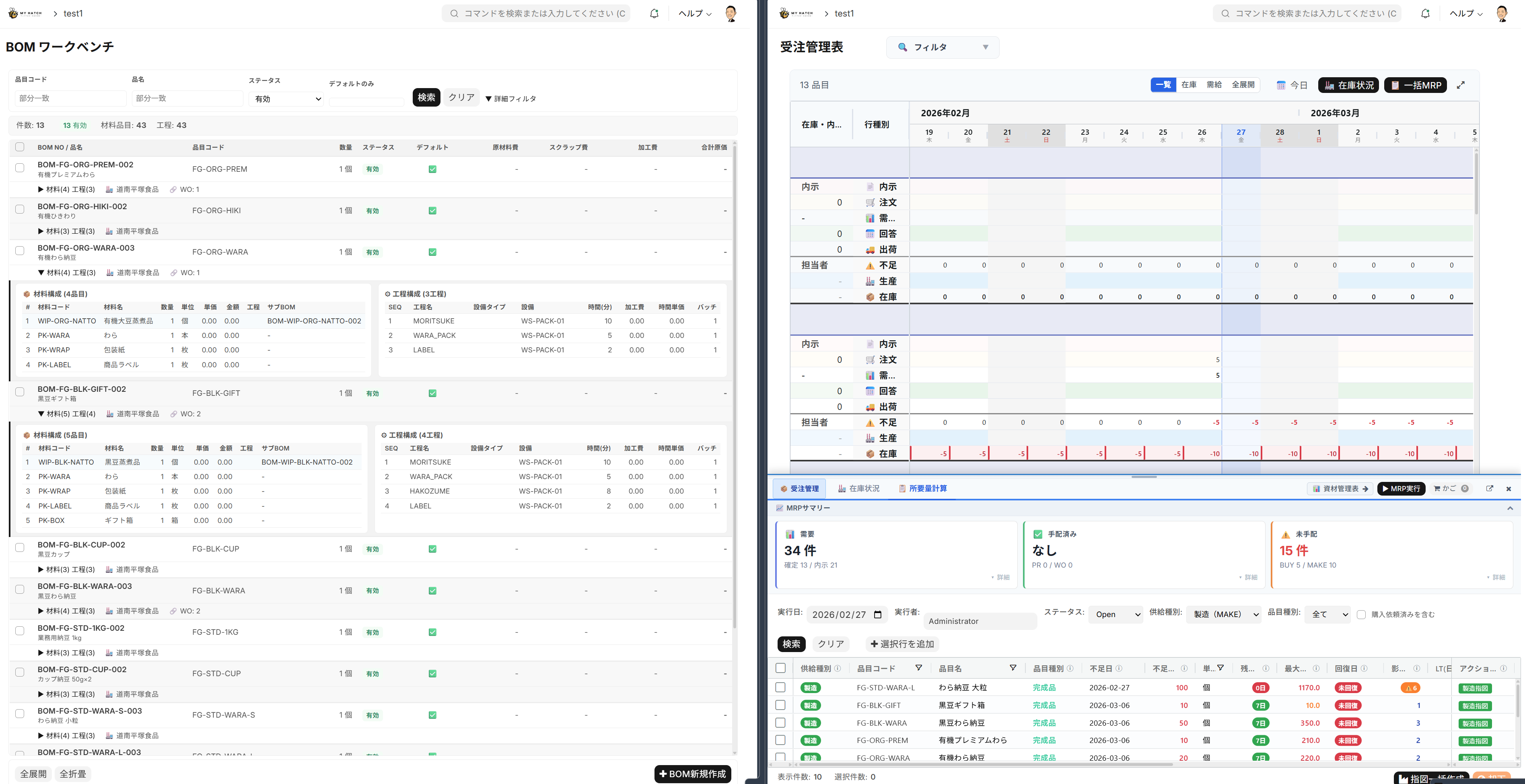 ERPNextは 13以上のモジュール を標準搭載。製造業・食品加工業に特化した機能も充実しています。 下の画面は、BOM(部品表)ワークベンチと受注管理表、MRPサマリーの実際の画面です。