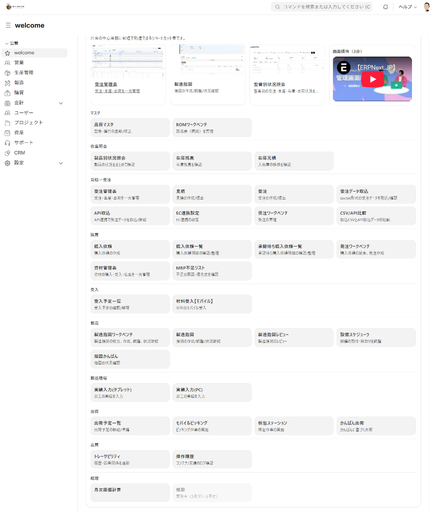 ログインすると最初に表示されるワークスペースです。 営業・生産管理・購買・会計など 業務別のショートカット がカード形式で並び、受注管理表・製造指図・MRP不足リストなどの主要画面にワンクリックでアクセスできます。