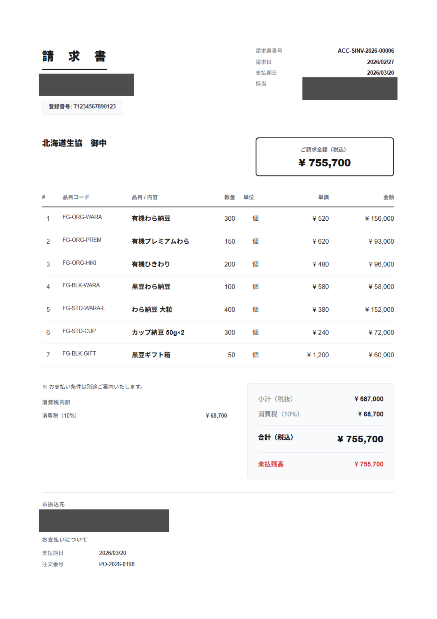 ERPNext.JPから出力される実際の請求書です。インボイス制度対応の登録番号、消費税の内訳、合計金額が日本の商習慣に沿ったフォーマットで自動出力されます。