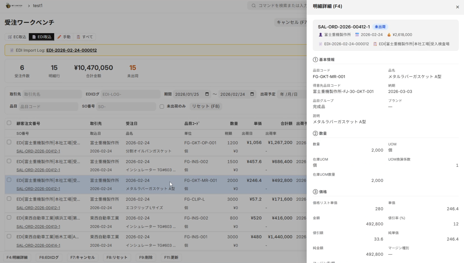 受注業務を1画面で完結させる 受注ワークベンチ 画面です。 EDI(電子データ交換)から取り込んだ注文データを一覧表示し、品目コード・数量・単価・出荷予定をリアルタイムに確認。明細をクリックすれば詳細がサイドパネルで即座に表示されます。