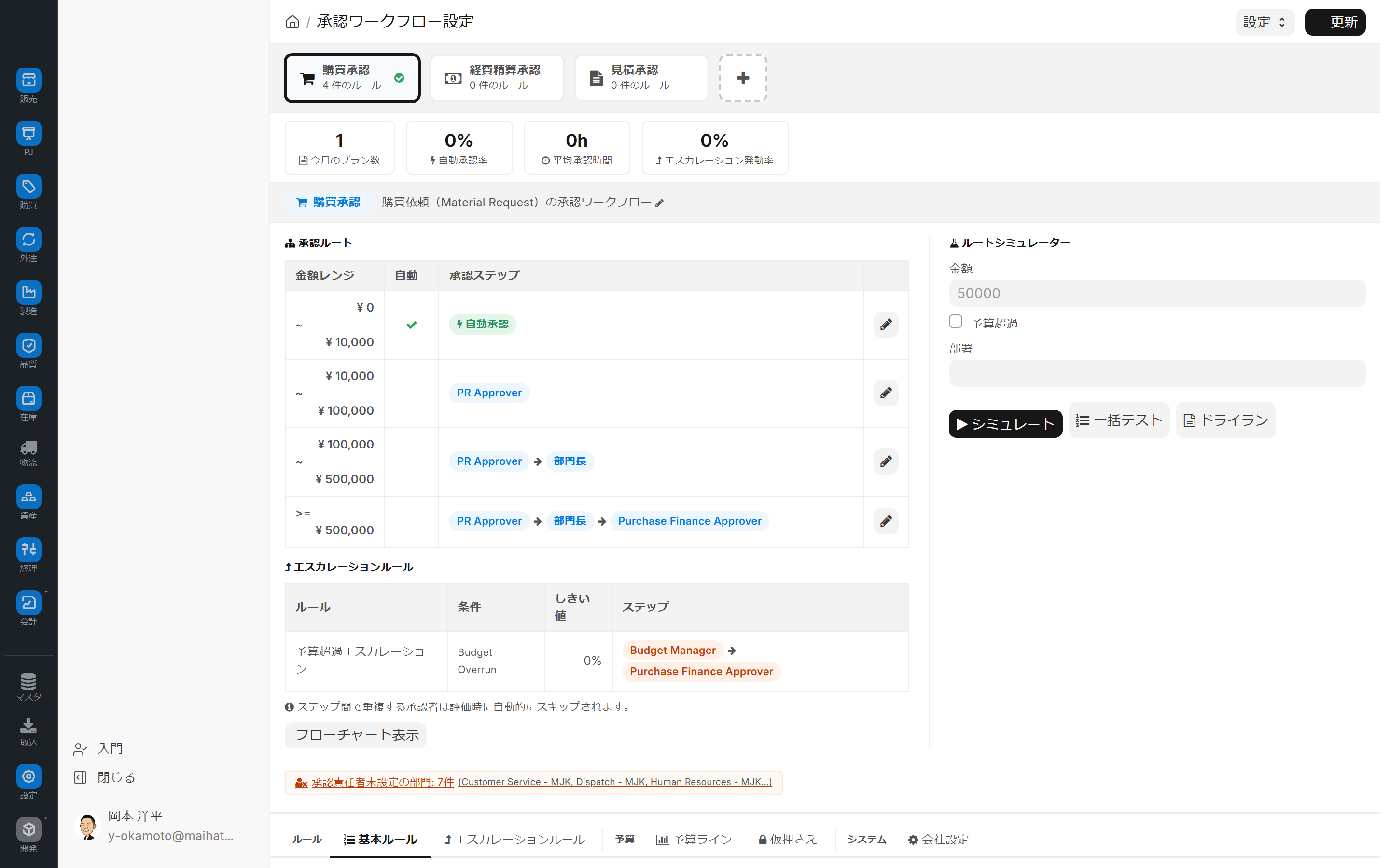 | 予算超過エスカレーション | Budget Overrun | 0% | Budget Manager → Purchase Finance Approver |