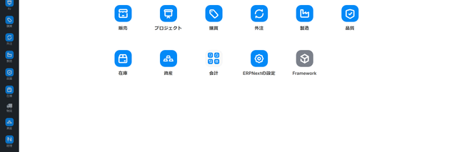 ログイン直後に表示される ホーム(モジュールランチャー) (/desk/desktop) は、全ロール共通の入口です。業務モジュール単位のアイコンが並び、そこから各業務のハブ画面・ワークベンチ・DocType 一覧へ分岐していきます。