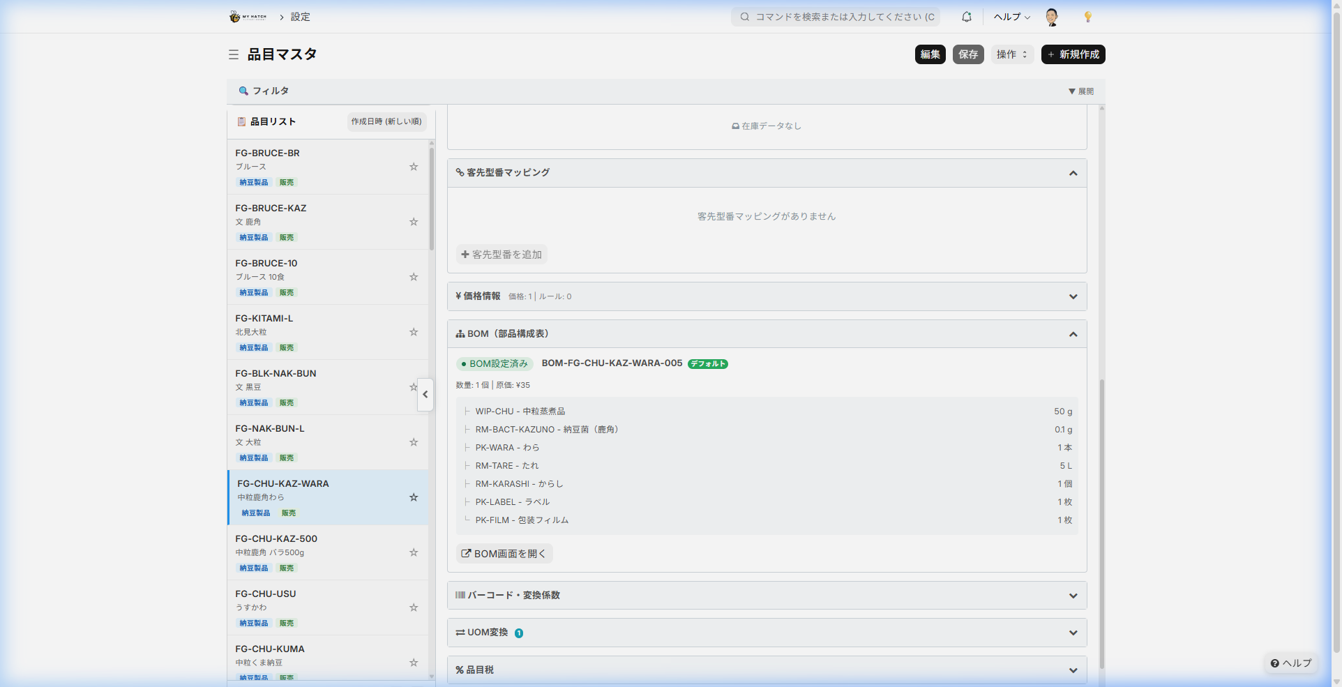 この品目に設定されているBOMの情報(構成材料・数量・原価)を確認できます。BOM未設定の場合は「新規BOMを作成」ボタンから作成画面に移動できます。