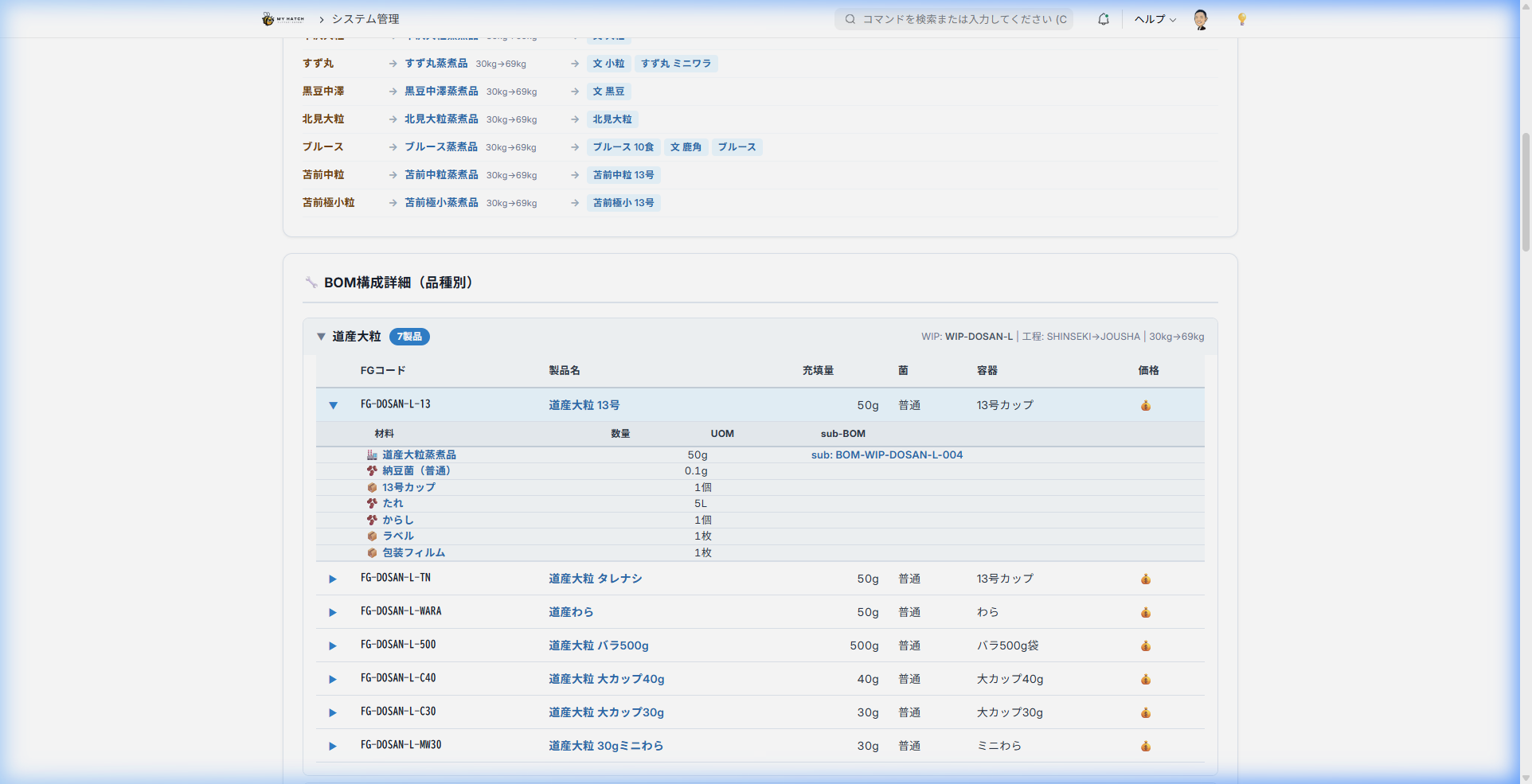 蒸煮品の品種ごとに折りたたみ式で完成品の一覧を表示します。