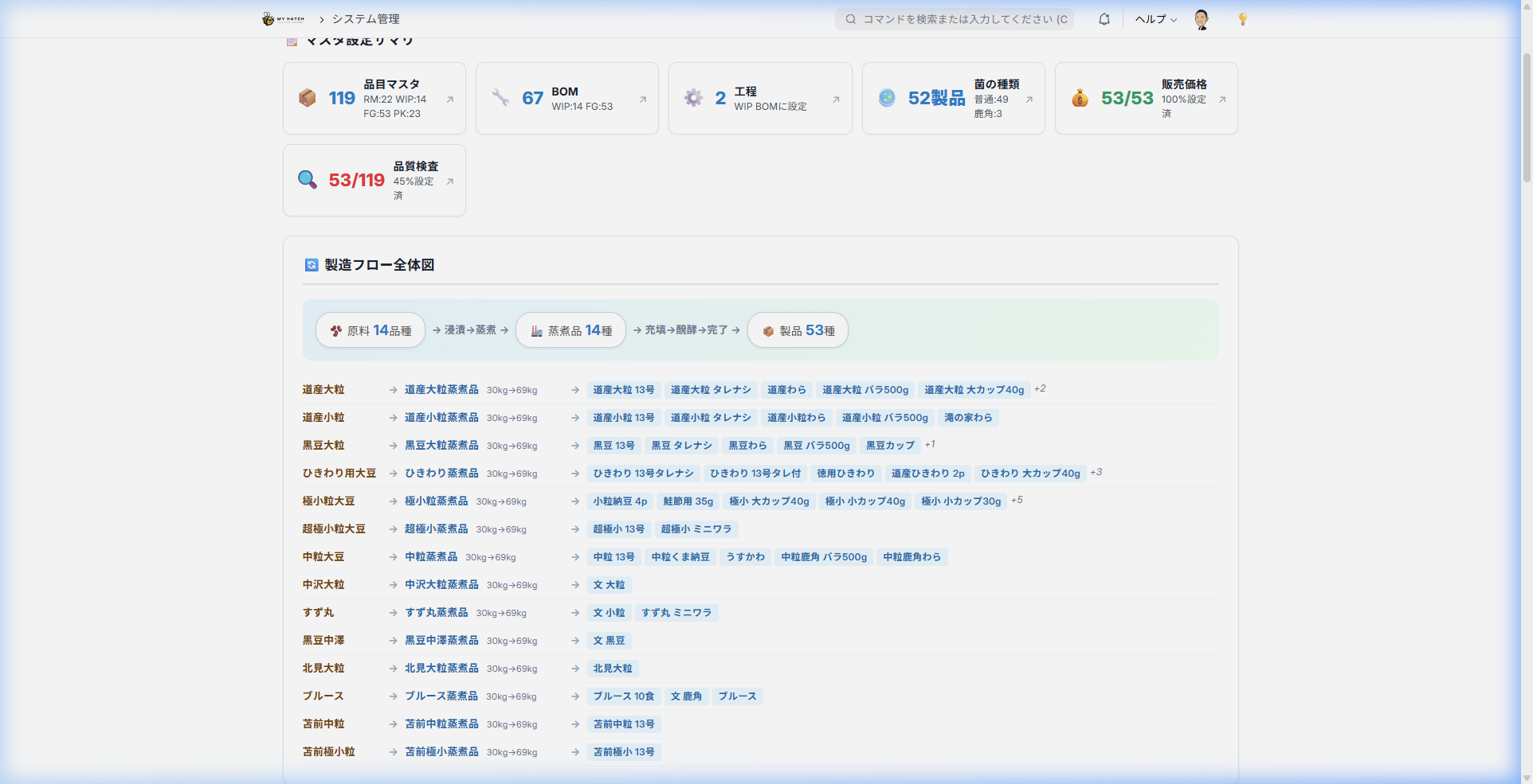 | 品目マスタ | 全品目数と種類別の内訳(原材料・仕掛品・完成品・包装資材) |