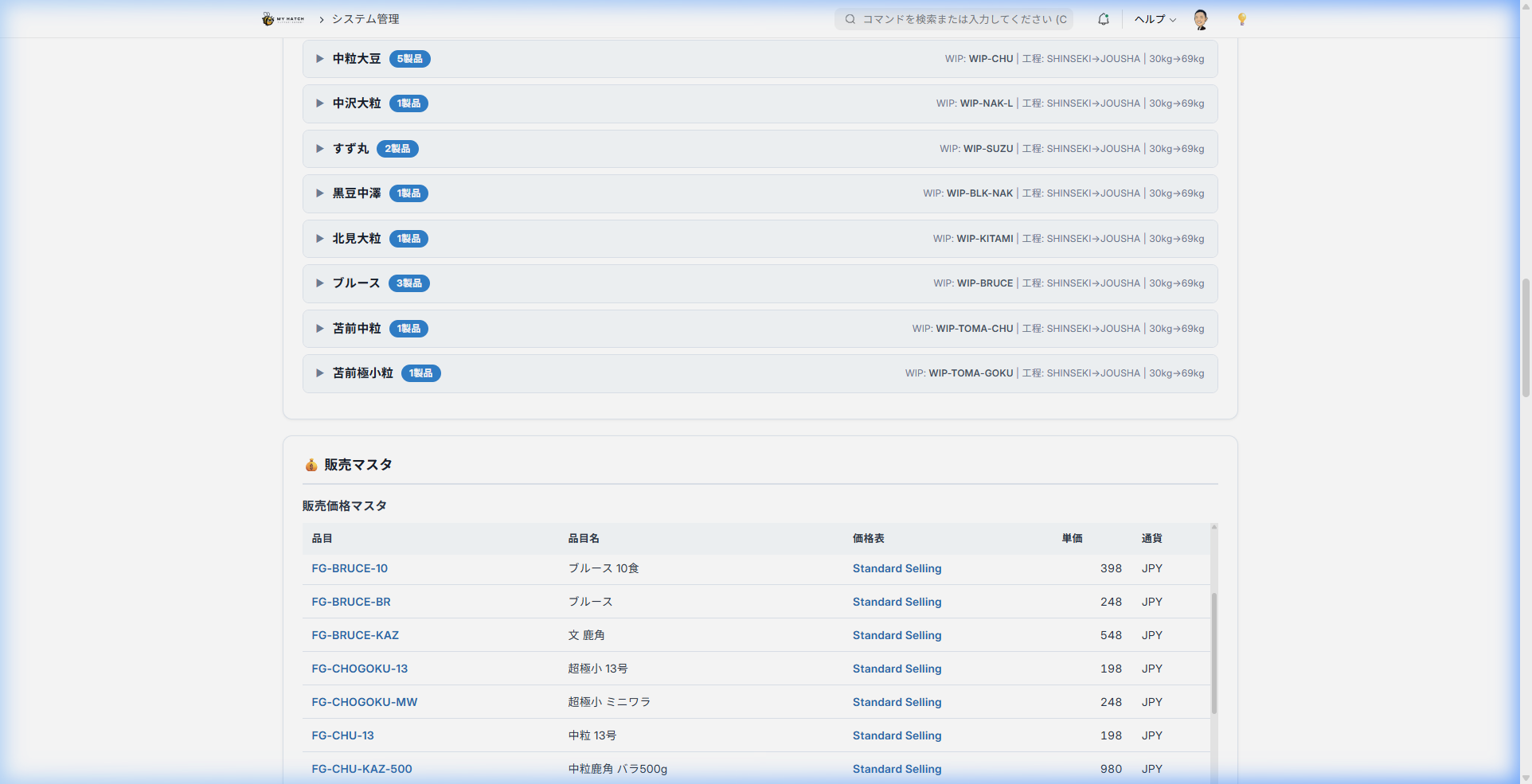 | 品目グループ | 完成品・原材料・仕掛品・包装資材 などで絞り込み |