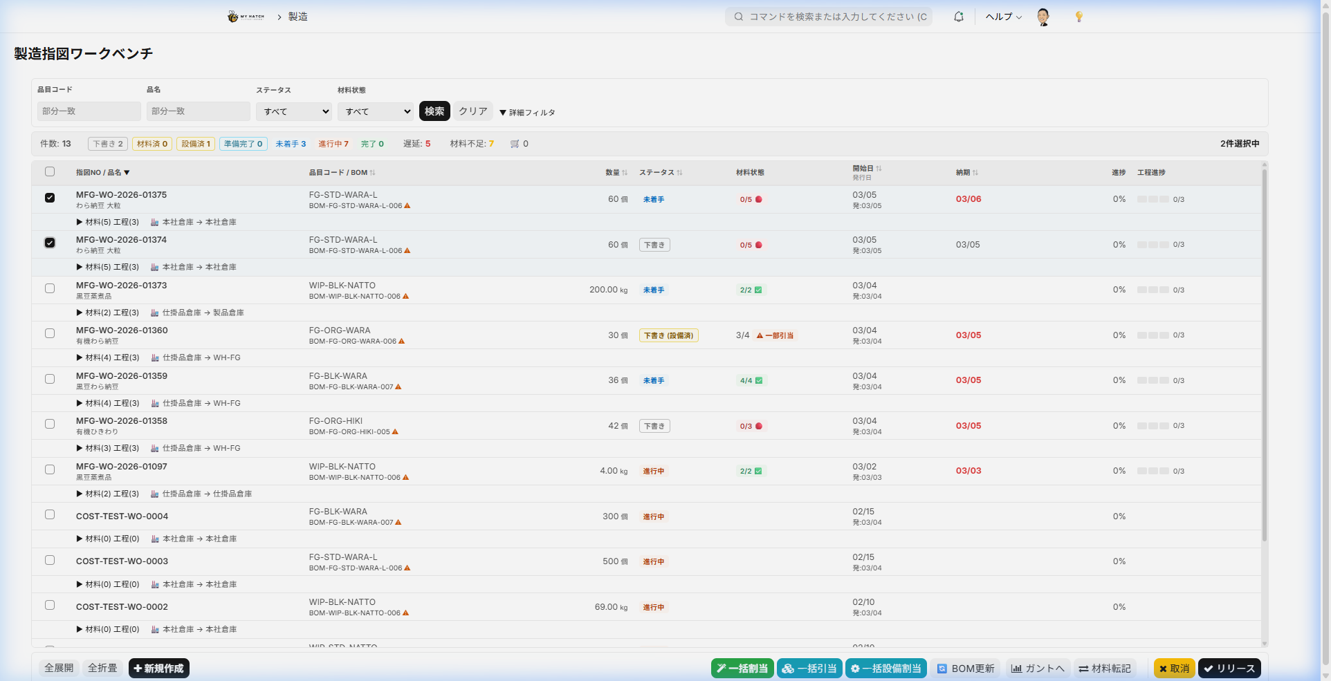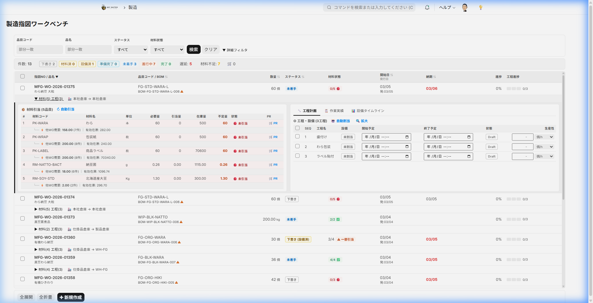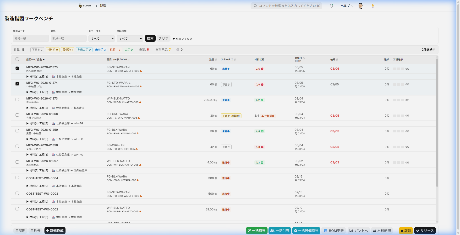 製造指図一覧(Work Order List)は、生産提案ダッシュボード で作成された指図を受け取り、材料の引当・設備の割当をワンクリックで完了 し、「現場がすぐ動ける指示」に仕上げるカスタムページです。