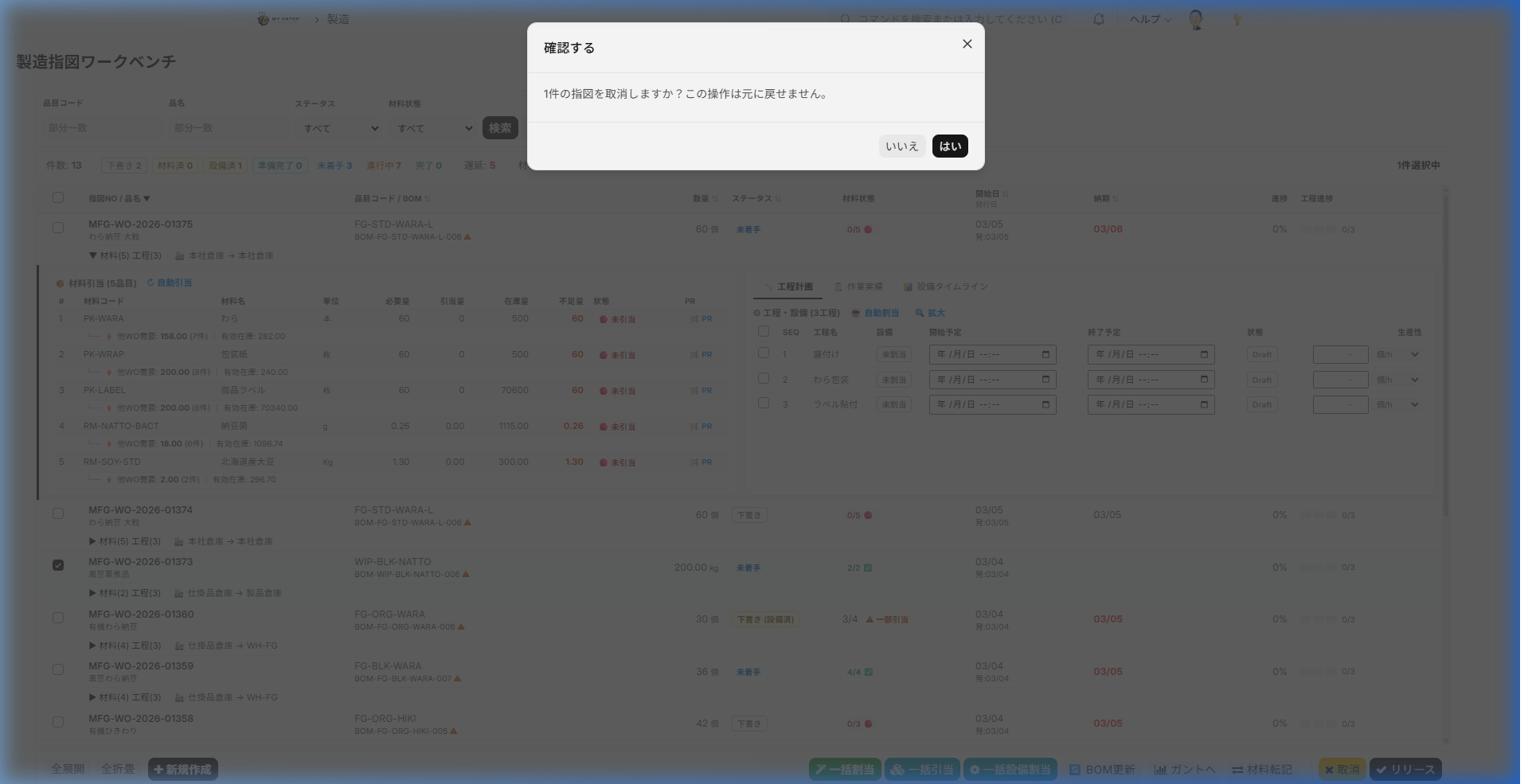 計画変更が入った場合、関連ドキュメントを 安全にまとめて取消・削除 できます。ERPの常識では「実績が入ると消せない」が、本システムでは 条件を満たす範囲で安全にカスケード処理 が可能です。