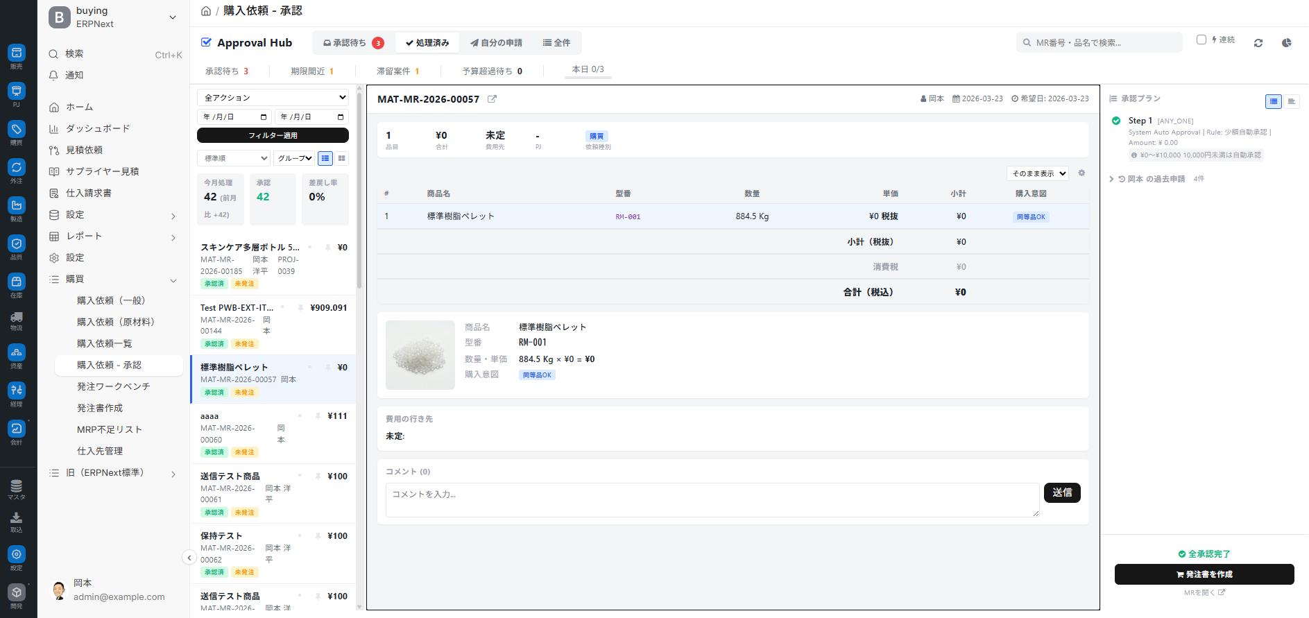 関連記事 依頼の起票は 購入依頼ハブ(一般) / 購入依頼カート(原材料) から。 承認後の発注は 発注ワークベンチ / 発注書作成エディタ。 承認ルート・ロールの設定は管理者向け記事 承認ワークフロー設定 を参照。