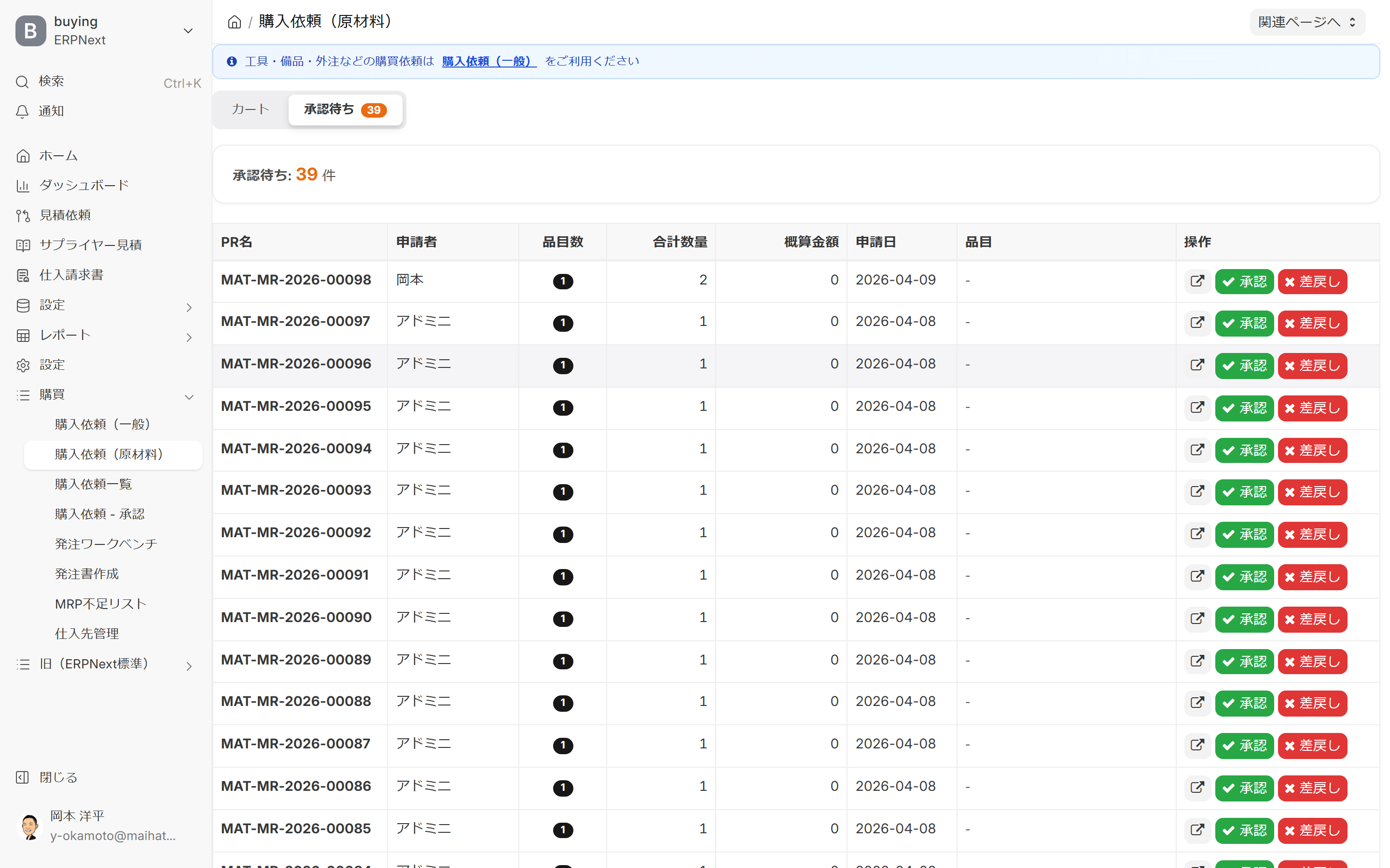 承認待ち タブでは、自分が起票した(または会社全体の)購入依頼の承認状況を確認できます。