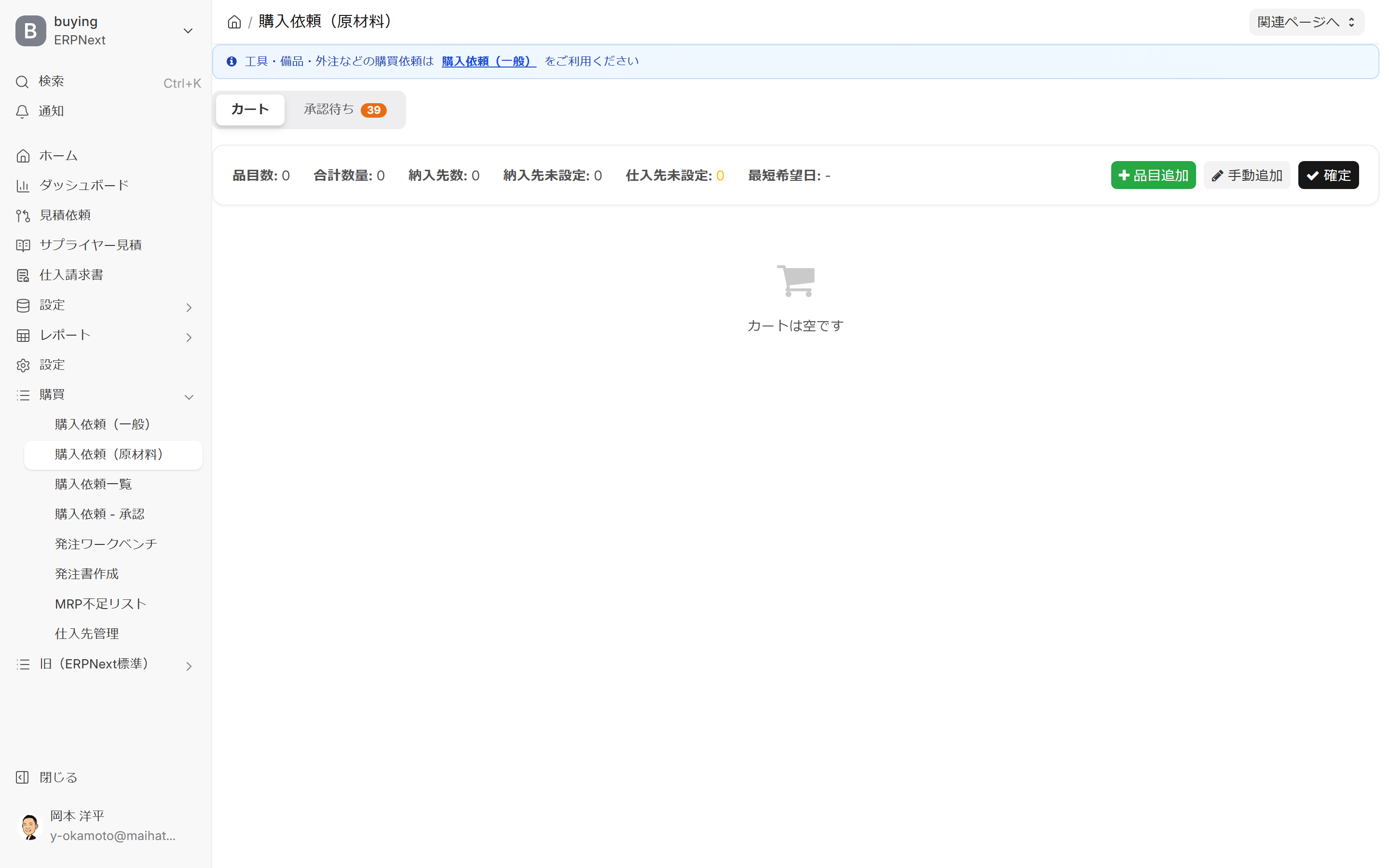 購入依頼カートは、製造で使う 原材料の不足を、ネットショッピングのカートのようにまとめて購入依頼として起票 するための画面です。MRP(資材所要量計画)や製造指図から検出された不足情報を、品目ごとに数量を確認しながらカートに入れ、一括で購入依頼(Material Request)に変換できます。