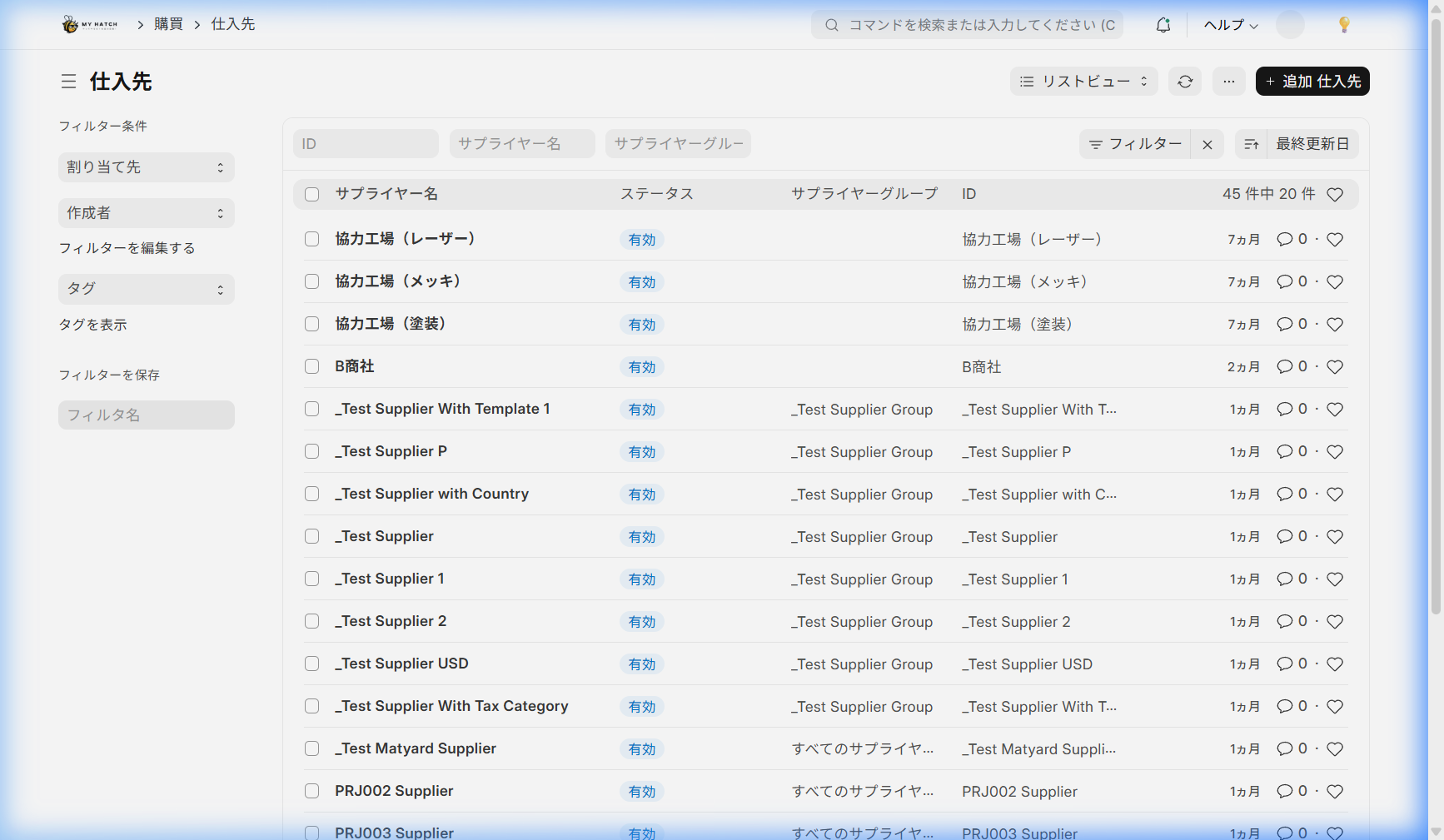 ERPNextでは、原材料や商品を仕入れる取引先の情報を「仕入先(Supplier)」マスタで管理します。発注書・入荷記録・仕入請求書など、すべての購買帳票はこの仕入先マスタに紐づきます。