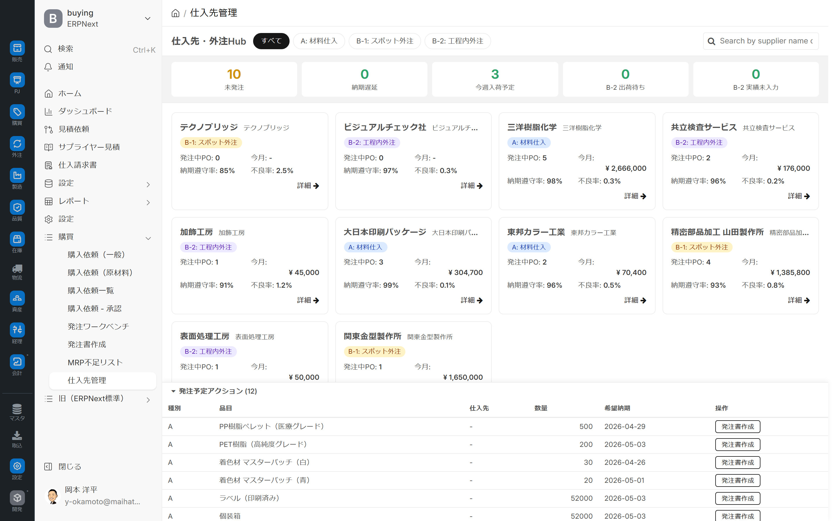 仕入先管理(Supplier Hub)は、取引中のすべての仕入先を 1 画面でカード形式に俯瞰し、納期遵守率・不良率・直近の入荷予定・発注予定アクションを把握 するための画面です。仕入先ごとのパフォーマンス比較や、外注運用の優先度判断に活用します。