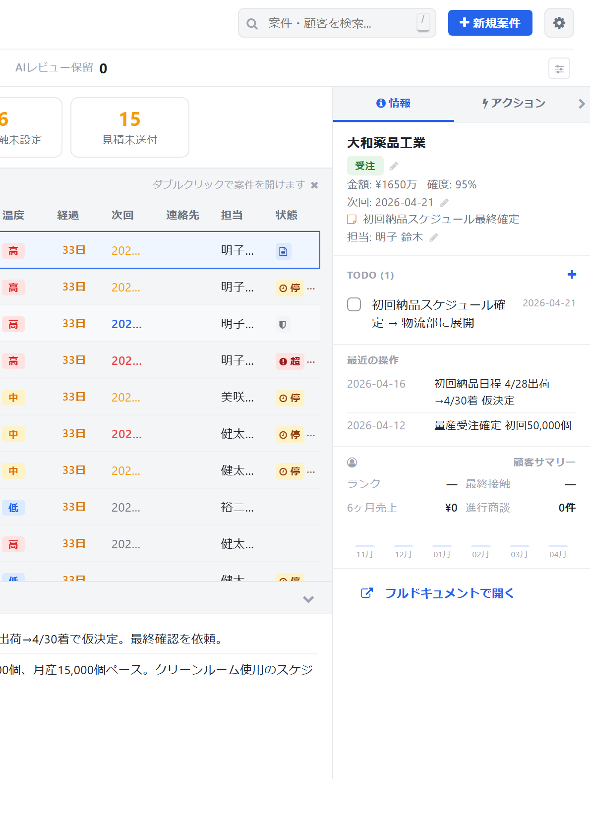 | 顧客ミニカード | 顧客名ホバーで直近情報をポップアップ表示 |