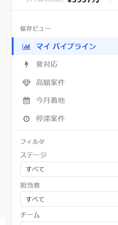 パイプラインビューに切り替えると、ステージ別の件数・金額が一覧できます。