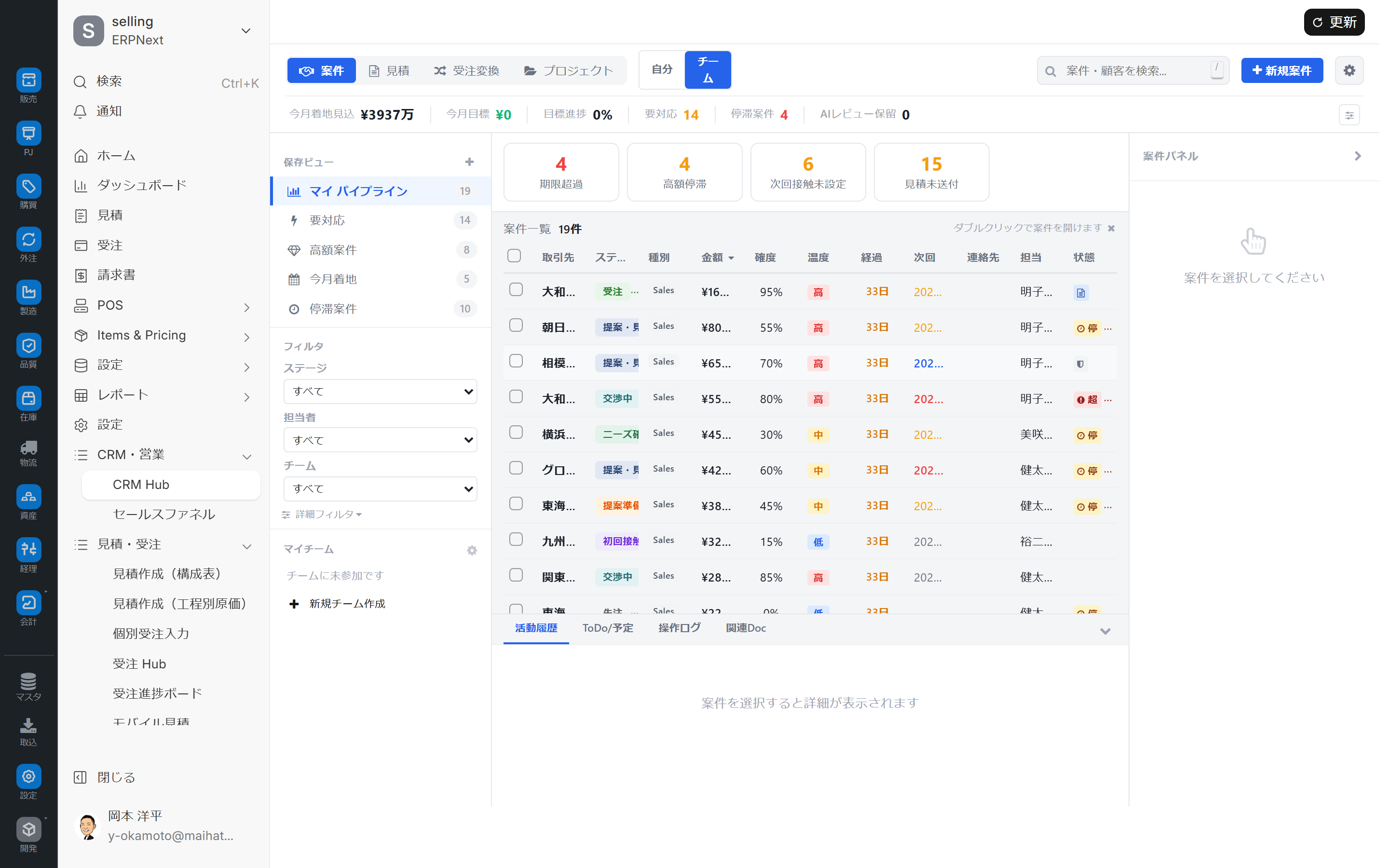 右ペインの「活動」タブを開くと、選択案件の活動タイムラインが表示されます。