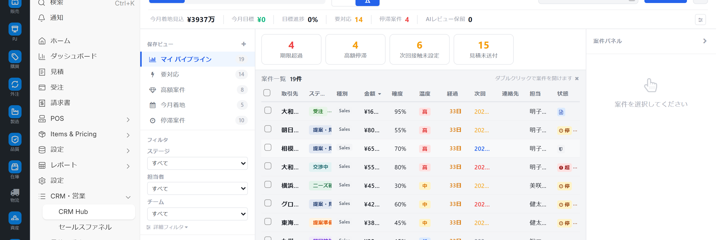 | 左ペイン | ビュー切替(pipeline / list / kanban 等)+ 保存ビュー |